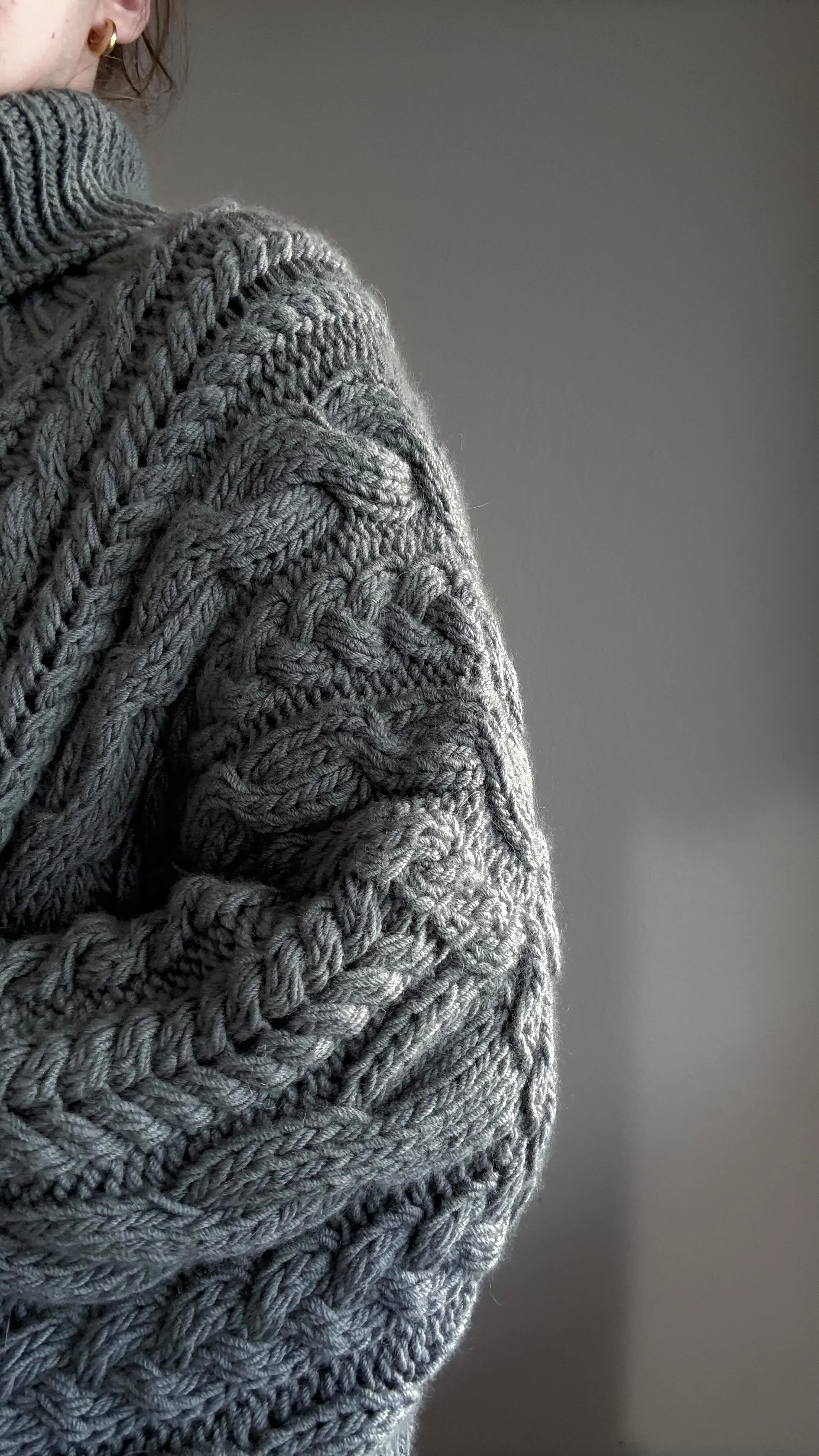 The sleeves are worked with gradual decreases for shaping and finished with a long ribbed cuff. The body is worked in the round and finished with a ribbed hem.